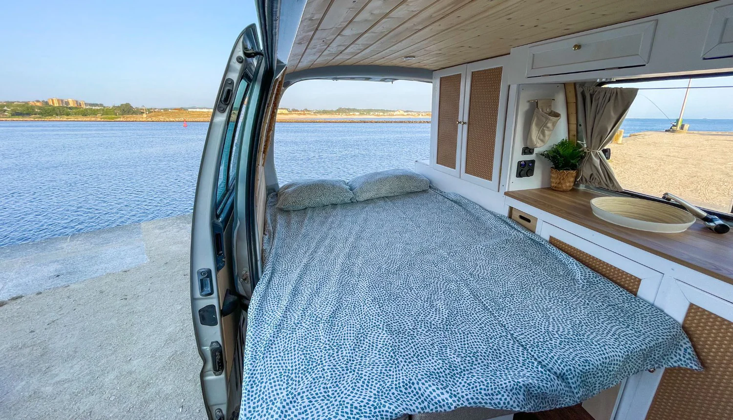 Wanneer je binnenkomt via de schuifdeur kijk je eerst op een keukenblok met een ingebouwde koelkast en een wastafel die is aangesloten op twee water tanks (voor vers en vuil water). Kijk je naar links dan zie je een ruim tweepersoonsbed van 140×200 cm, voorzien van beddengoed en schoon bedlinnen. Het comfortabele matras bestaat uit twee delen en ligt op een inschuifbaar frame, waardoor je het bed overdag ook kan omtoveren tot een comfortabel bankje. Hier tegenover vind je een uitklapbare tafel, waar je met z’n tweeën aan kan zitten. De minivan is sfeervol afgewerkt met hout en beschikt over verschillende kastjes om je spullen in op te bergen. Voor grotere items, zoals tassen en surfboards, is er voldoende ruimte onder het bed.
